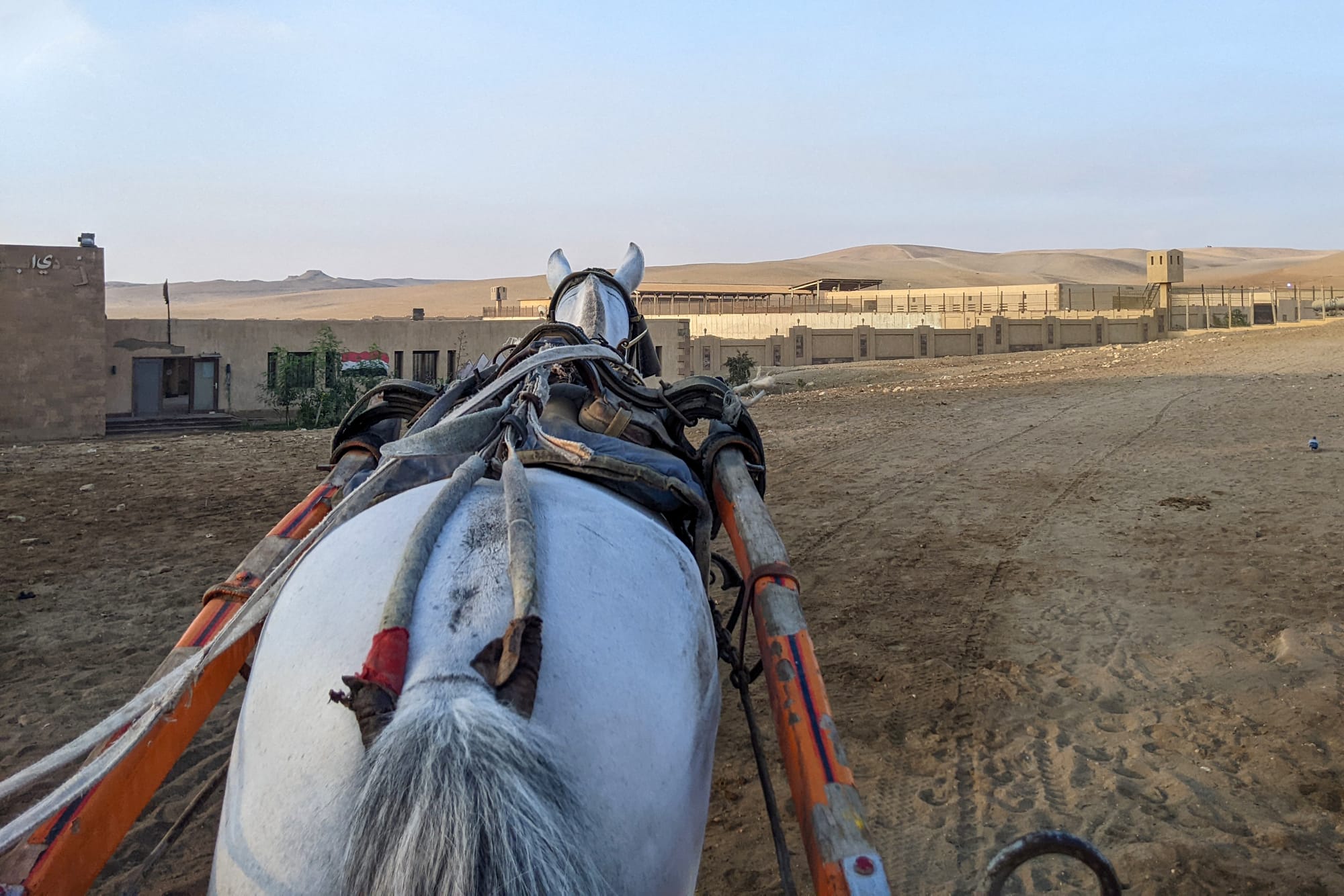 The shade of night was turning from black to purple. I was running out of time. This was just the start of a multi-day trip to many more obscure sites in Egypt; I had only that one morning and the next hour to pull this off. I suddenly remembered the horse trainers in the shanties of that neighborhood. I instructed the taxi to drop us off in that area. I literally jumped out while the taxi was still coming to a halt and ran to a young man tending to some horses. I said we need camels or horses, and that we need them quickly. He got the owner of that particular stable, and I explained the situation to him. I wanted him to take us south, along the perimeter of the security fence, and find a dune high enough that we could clear the fence below. He had a small horse-drawn carriage and said he could take us.