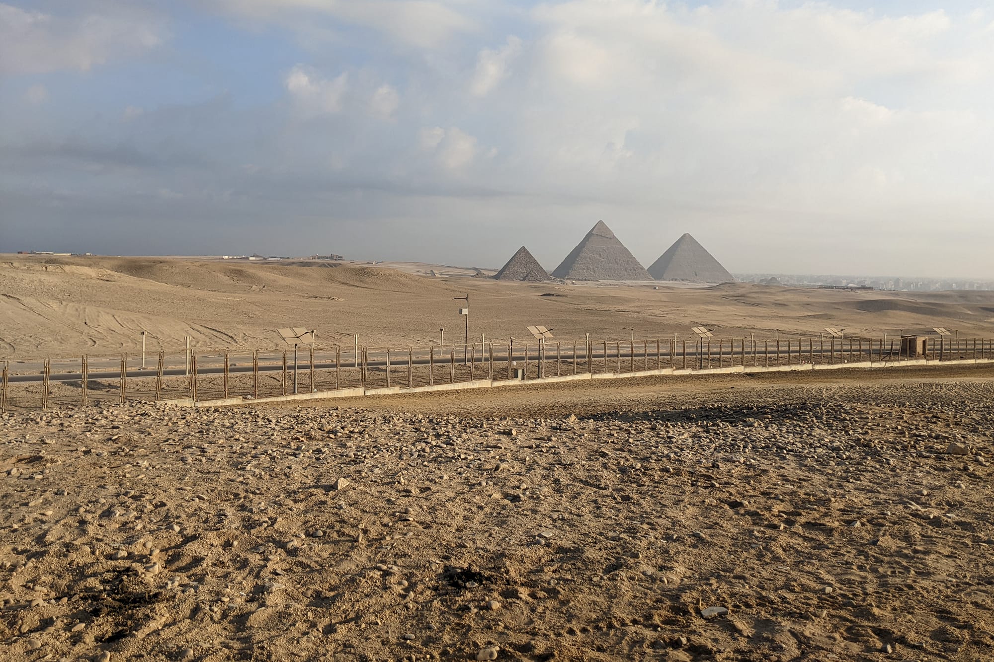 Merlin was understandably a bit nervous. My mission to get a good picture had now taken us to the back alleys of Cairo, along what looked like a maximum security fence, and into multiple checkpoints along the way. The first thing we saw was a police car, then we passed a half-rotten camel corpse. Merlin squeezed my hand; We were well out of Pizza Hut land now. Between the security points and the rising sun, I was in a tense state, to say the least. Finally, we hit a high dune, above the fenceline. Further away than I would have liked, but it would have to do.