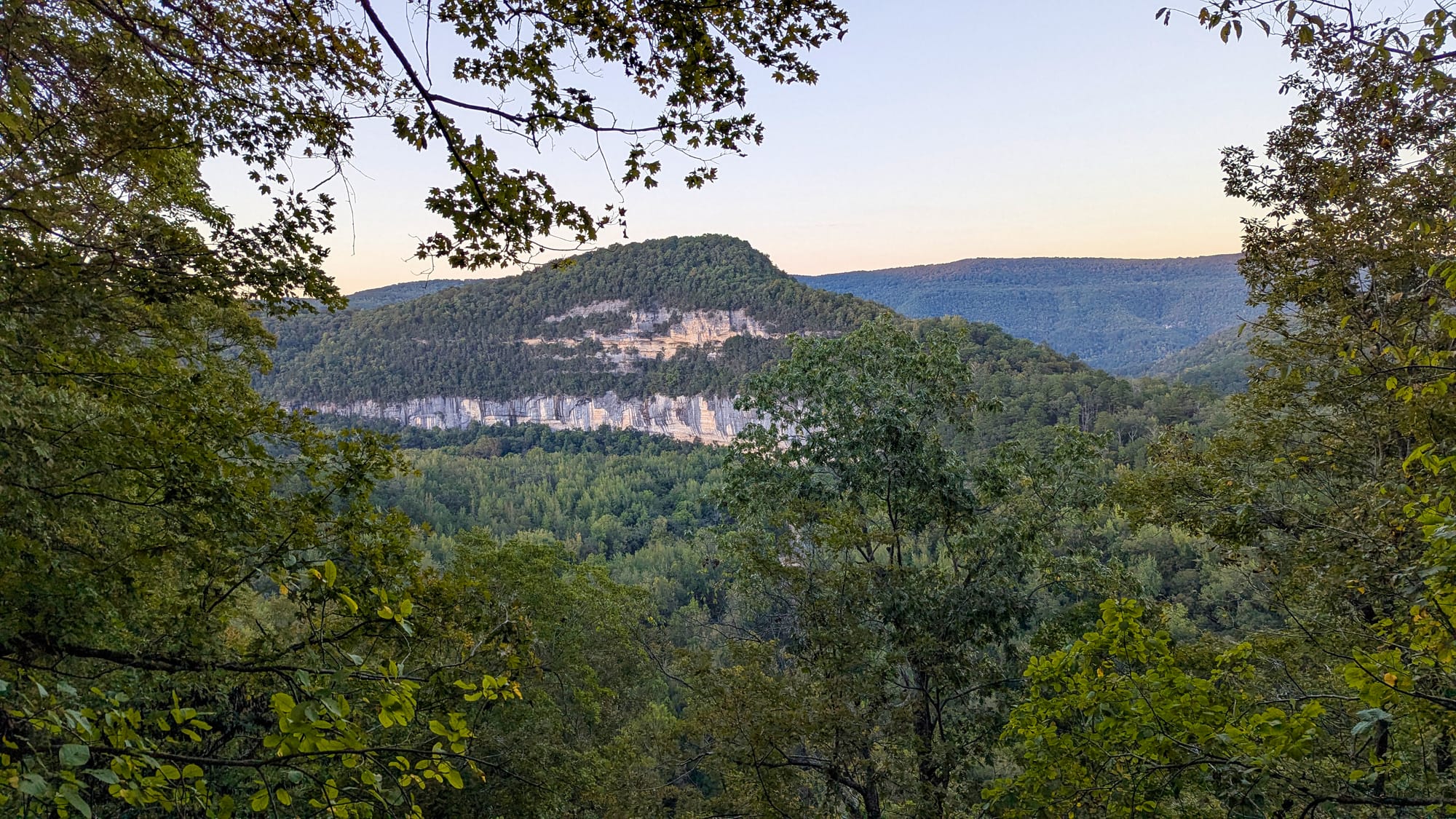 If we left at that moment, we would return just as the sun set. Kevin explained that he had found another route back called the Buffalo River Trail, which, unlike the Old River Trail, would only cross the water twice. This alternative route would take us back to the van but required a steep hike up and around the bluffs, following the snaking river from the top of the bluffs rather than along the water's edge below. Neither of us wanted to do another seven river crossings, so a rash decision was made. We headed towards the new trail back.