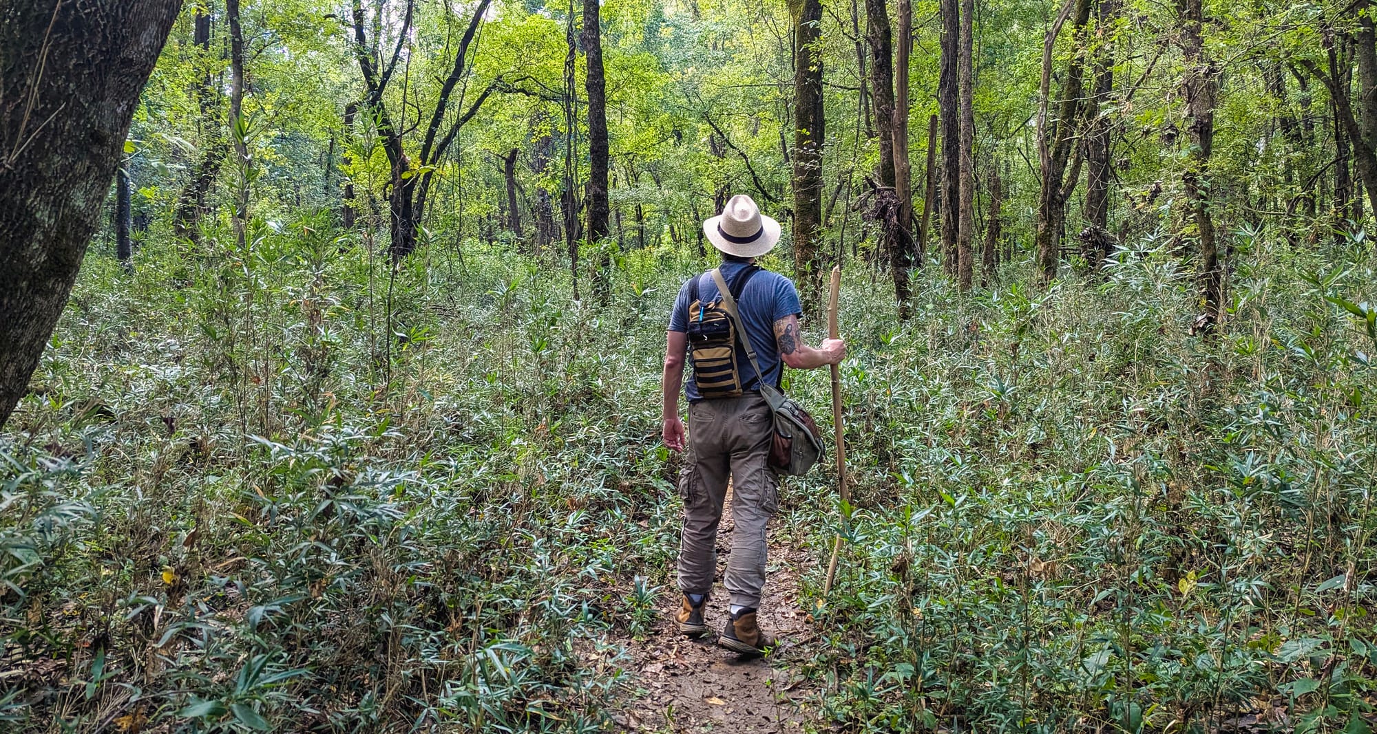 The cold water woke me up, and I suddenly felt alive with the thrill of the hunt. Surrounded by high rock bluffs on either side of the winding river, it was hard not to be energized by the vastness and beauty of the area. The river snaked back and forth, carving a deep channel into the surrounding landscape. The bluff wall would often come to the river's edge, alternating which side of the river this happened on with each passing bend. As such, the trail cut through the foliage between bends, but we often had to re-cross the fast-flowing water. Tall bamboo plants and other tangled vines could be found growing among a mix of deciduous and coniferous trees, giving parts of the trail a slightly jungle-like atmosphere in the morning haze.