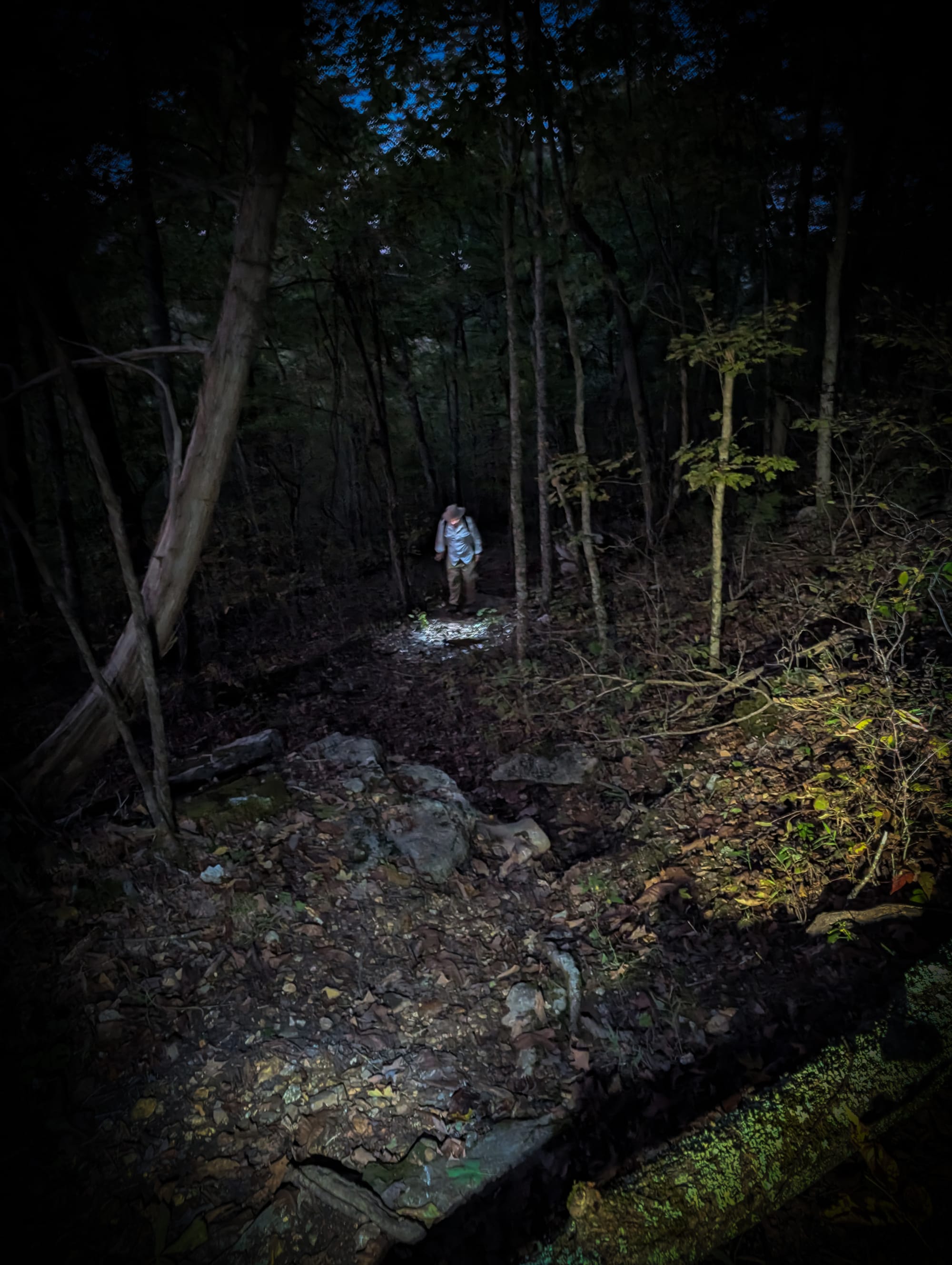 I attached my MagSafe battery bank to the back of my phone, and even though the trail was now mostly gone, my map showed me where it "should" have been. I plowed ahead, looking for pitfalls and trying to pick up some semblance of the trail while Kevin hobbled behind. Whenever the trail would be easily lost or there was a hazard on the path, I would stop, turn around, and light the route behind me until Kevin caught up. We moved like this until 11 pm, a full seven hours after we had started the trail back. Finally, after one last water crossing in the dark, we reached the Mystery Van. Gaia showed we had been hiking for almost 14 hours and covered 20km in that time. To Kevin’s credit, he suffered through the pain and managed to complete the hike back out.